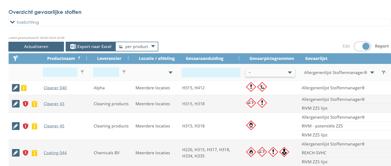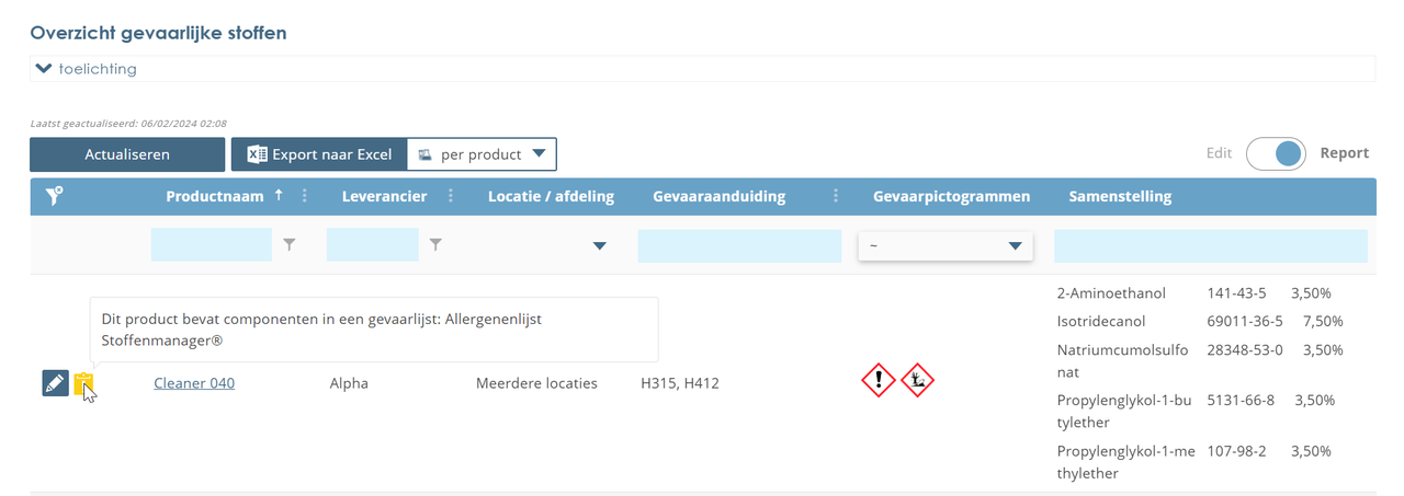 Door het gele klembordje aan de linkerkant ziet u of één of meerdere componenten op een gevaarlijst staan. Als u op het klembordje gaat staan, ziet u op welke lijst één of meer componenten voorkomen.
