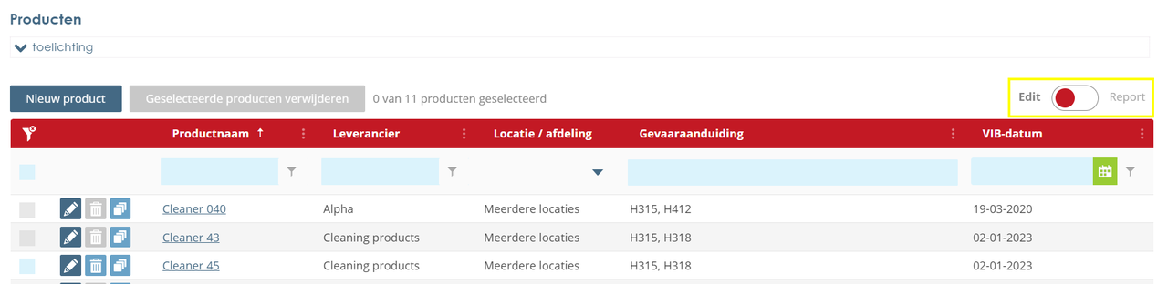 Om te zien welke allergenen binnen uw bedrijf zijn, gaat u naar uw "Productenoverzicht". Ga vervolgens met de toggle-knop naar het "Report-overzicht".