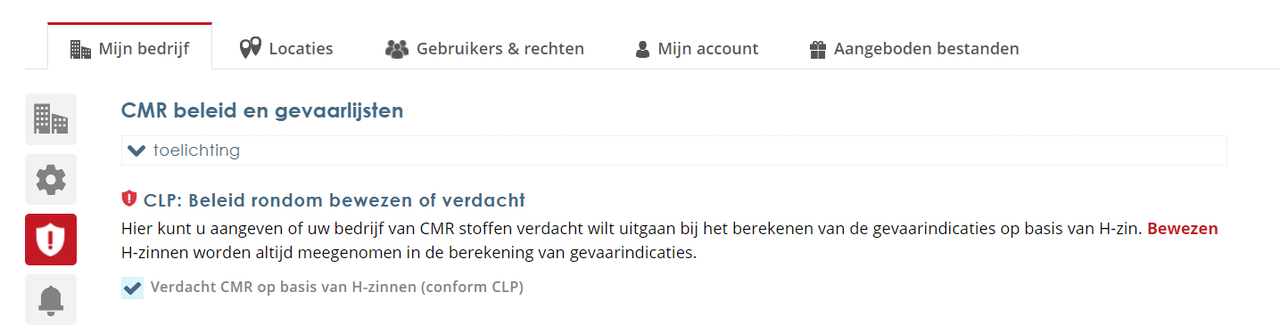 Scroll naar beneden en ga naar “Gevaarlijsten”. Zet een vinkje bij de gewenste lijsten Stoffenmanager®" en Klik op “Opslaan”.