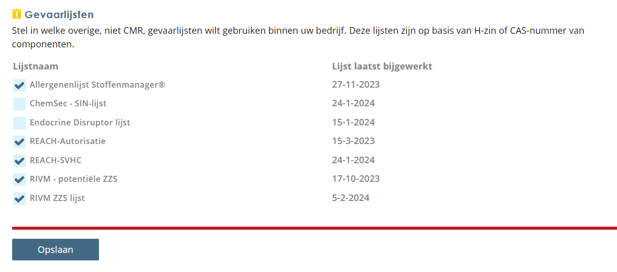 Scroll naar beneden en ga naar “Gevaarlijsten”. Zet een vinkje bij de gewenste lijsten Stoffenmanager®" en Klik op “Opslaan”.